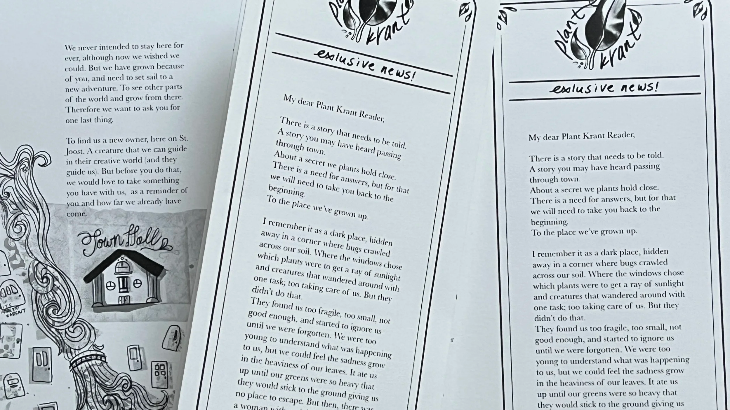 Frits grew bigger and stronger then we could have ever imagined. The caregivers of Dot and Pluk found their way around it and took care of other plants. I grew a new leaf, small but strong. Klei Kabouters that came to live in our little town. But the thing that stood out for us as plants were you, the writers, our caregivers. You found a voice, or some sort of beginning to what you have to say in this world. You might think we have come into your lives as plants in need of attention and care, which is still true, but we were also a reminder for you. To show up for yourself, for us, your ideas, and stories and to give them what they need to grow big. And you did just that. Your projects have become more you with the tools you gathered and let it become the best it could. But now it's time for you to let it go, give your work to the world and dare to let it off your chest. Because, my dear writer, your work is not you. This world needs our work to roam this earth, with greens, roots and all the air we have to give, but therefore you have to take a step back and let it go.